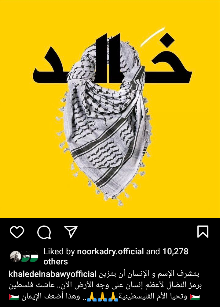 بينما كتب الفنان خالد النبوي عبر حسابه الرسمي بموقع تبادل الصور والفيديوهات انستجرام: يتشرف الإسم و الإنسان أن يتزين برمز النضال لأعظم إنسان على وجه الأرض الآن.. عاشت فلسطين، وتحيا الأم الفليسطينية.. وهذا أضعف الإيمان.