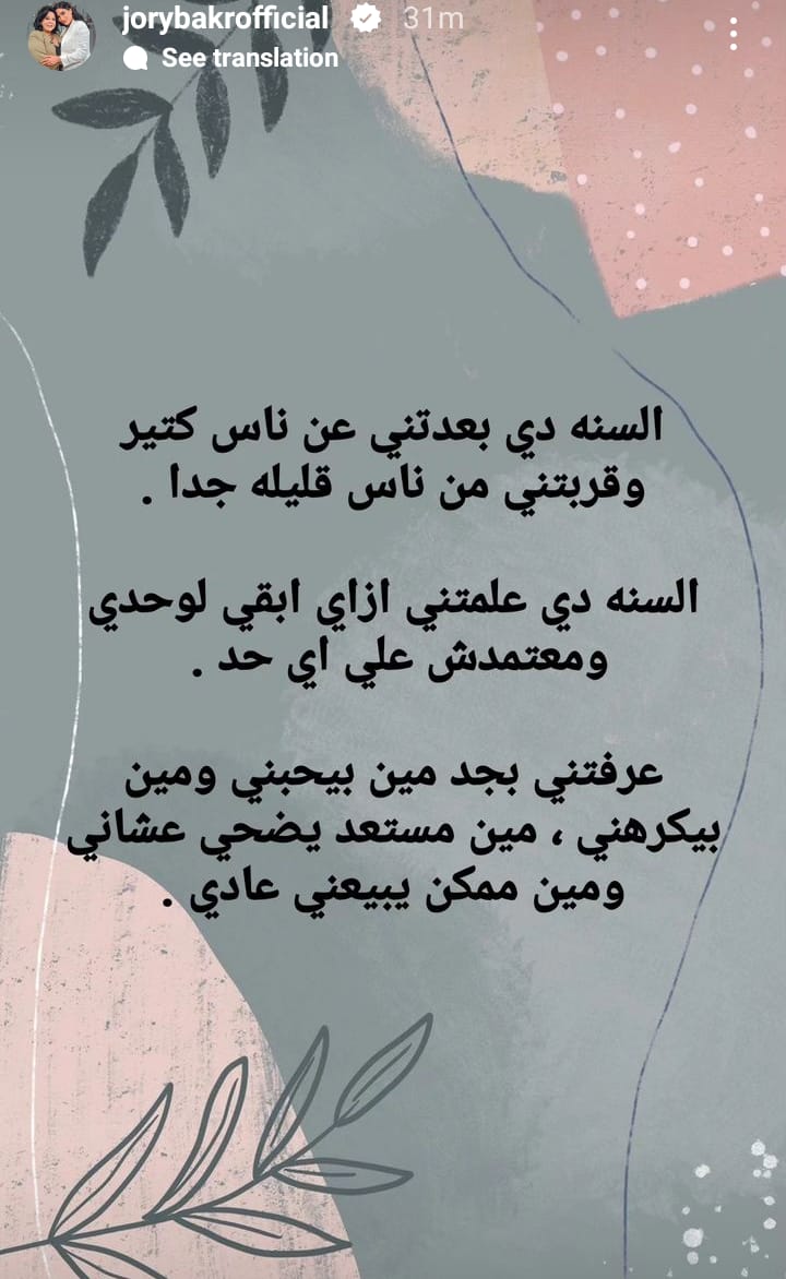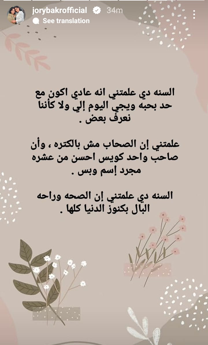 وكتبت جوري بكر عبر انستجرام: السنة دي علمتني إنه عادي أكون مع حد بحبه ويجي اليوم اللي ولا كأننا نعرف بعض، علمتني إن الصحاب مش بالكترة وأن صاحب واحد كويس أحسن من عشرة مجرد اسم وبس، السنة دي عملتني إن الصحة وراحة البال بكنوز الدنيا كلها.