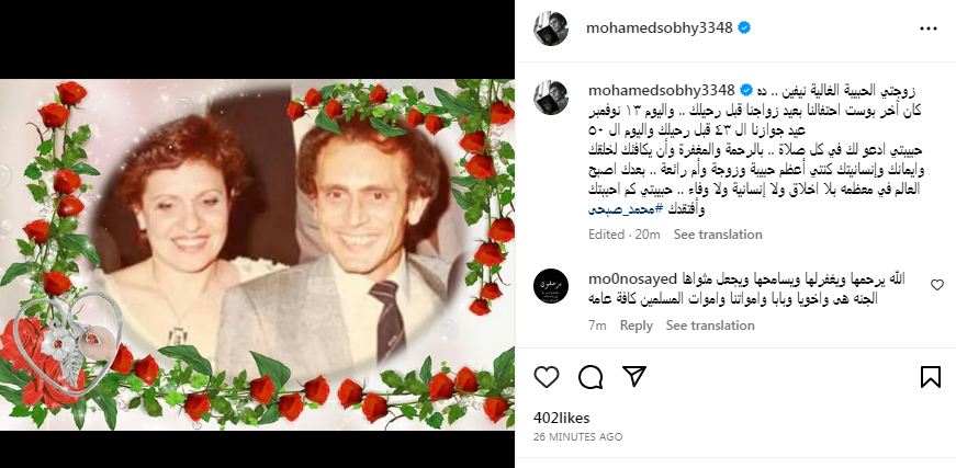 علق محمد صبحي على المنشور قائلًا: "زوجتي الحبيبة الغالية نيفين .. ده كان آخر بوست احتفالنا بعيد زواجنا قبل رحيلك .. واليوم ١٣ نوفمبر عيد جوازنا الـ ٤٣ قبل رحيلك واليوم الـ ٥٠