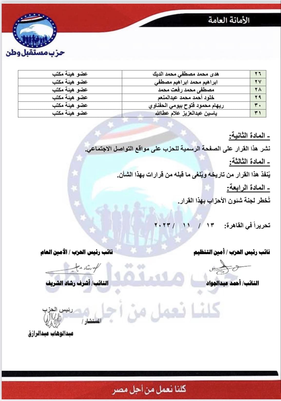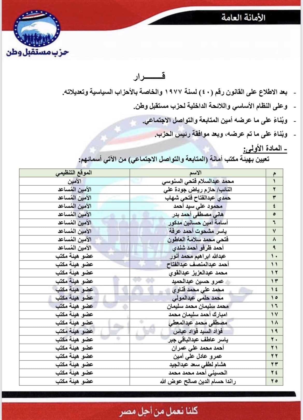 ونشرت الصفحة الرسمية لحزب مستقبل وطن قرار التشكيل والذي، جاء كالتالي: