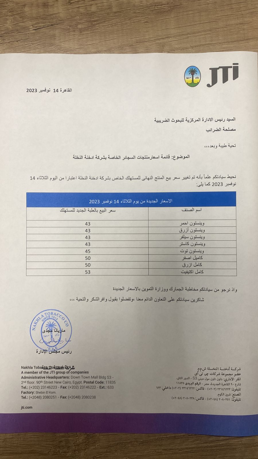 وعن أسعار السجائر اليوم، فإن القانون يشير إلى زيادة القيمة المضافة بنحو 50 قرشا في أسعار منتجات التبغ بمختلف أنواعها، بما في ذلك منتجات التبغ الساخنة والتبغ السائل، وفقا لما نشر بالجريدة الرسمية، لذا قامت شركة أدخنة النخلة بإرسال خطاب إلى جهاز حماية المستهلك حصل موقع «تحيا مصر» على نسخة منه، بأسعار سجائر وينستون اليوم، والتي جاءت كالآتي: