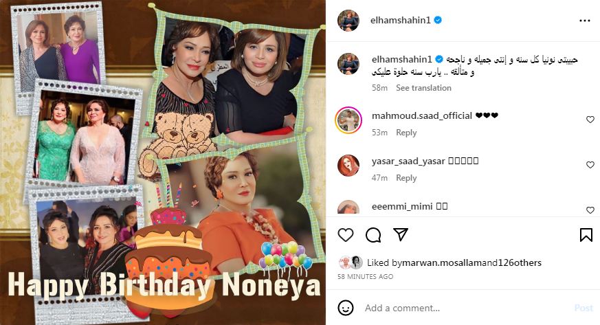 حرصت الفنانة إلهام شاهين على تهنئة لبلبة بعيد ميلادها من خلال نشر صورة مجمعة لهما معًا عبر حسابها الرسمي بموقع تبادل الصور والفيديوهات الإنستجرام، وعلقت عليها إلهام شاهين قائلة: "حبيبتى نونيا كل سنة وأنتى جميلة وناجحة ومتألقة .. يارب سنة حلوة عليكي".