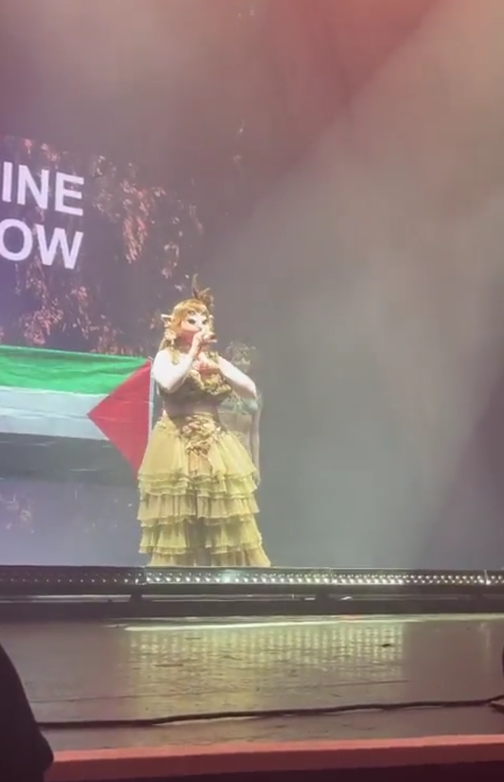 قامت المطربة البريطانية ميلاني مارتينيز برفع العلم الفلسطيني في نهاية حفلها الاخير الذي أقامته أمس متحدثة أمام الحاضرين عن الوضع المأساوي الذي تمر به فلسطين في الفترة الحالية وتعرض الملايين للقتل، منشادة الحاضرين على الدخول على رابط للمطالبة بوقف إطلاق النار، قائلة: "احبكم جميعًا، ونحن مجتمع المحبة والرحمة ولذلك أقول فلسطين حرة وأوقفوا إطلاق النار الآن. اتبعوا هذا الرابط وطالبوا النواب بوقف إطلاق النار لأن الكثير يموتون وهذا بشع".