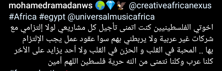وكتب محمد رمضان عبر حسابه الرسمي بموقع تبادل الصور والفيديوهات انستجرام، معلقا على فيديوهات من حفله الأخير في فرنسا: إخواتي الفلسطينيين، كنت أتمنى تأجيل كل مشاريعي، لولا وإلتزامي مع شركات غير عربية، ولا يربطني بهم سوى عقود عمل، يجب الالتزام بها.