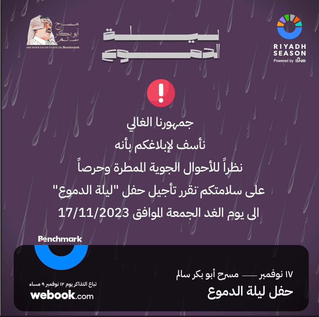 ونشرت إدارة موسم الرياض بيانًا جاء فيه: جمهورنا الغالي نأسف لإبلاغكم بأنه نظرًا للأحوال الجوية الممطرة، وحرصًا على سلامتكم، تقرر تأجيل حفل ليلة الدموع إلى يوم الغد الجمعة الموافق 17 نوفمبر.