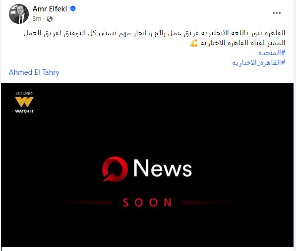 وخلال منشور عبر صفحته الشخصية، كشف عمرو الفقى الرئيس التنفيذي والعضو المنتدب للشركة المتحدة للخدمات الإعلامية، عن استعدادات الشركة المتحدة لإطلاق قناة القاهرة الإخبارية باللغة الإنجليزية في أقرب وقت.