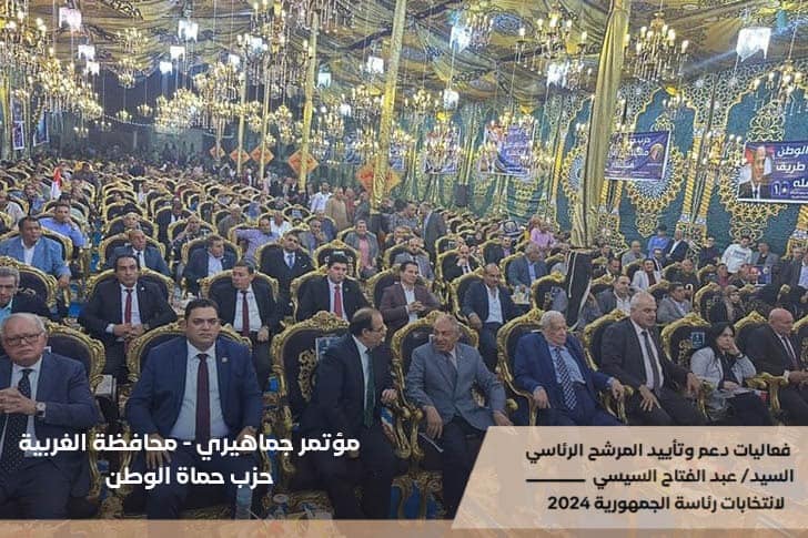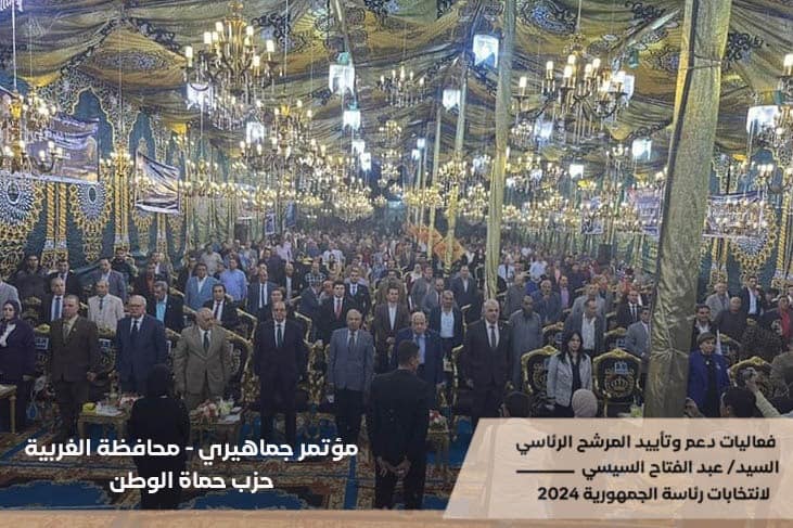 نظم حزب حماة الوطن بمحافظة الغربية، مؤتمراً جماهيرياً حاشداً، لدعم المرشح الرئاسي عبد الفتاح السيسي في الانتخابات الرئاسية المقبلة، بحضور كبير من أهالي المحافظة.