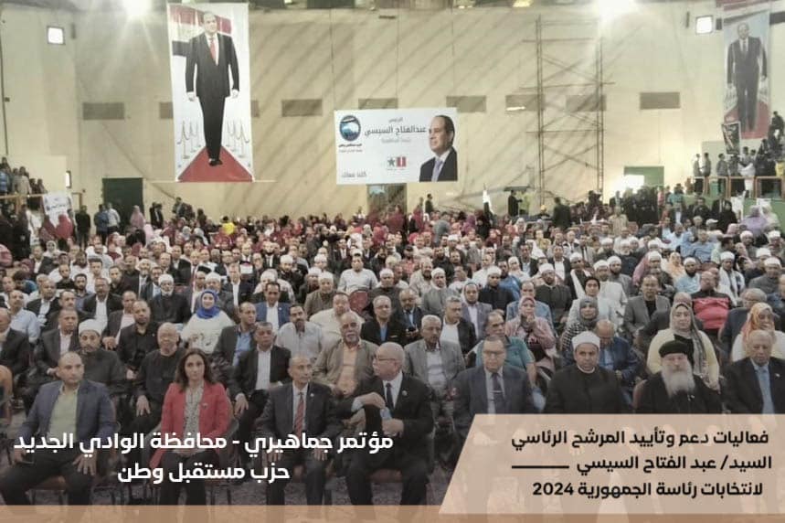 - نظمت أمانة حزب مستقبل وطن بمحافظة الوادي الجديد، مؤتمراً جماهيرياً حاشداً لدعم المرشح الرئاسي عبد الفتاح السيسي، في الإنتخابات الرئاسية 2024، بالصالة المغطاة بمدينة الخارجة، وسط حشد كبير من مواطني المحافظة، وبحضور أعضاء هيئة مكتب المحافظة والتنظيمات الحزبية بالاقسام والوحدات الحزبية.