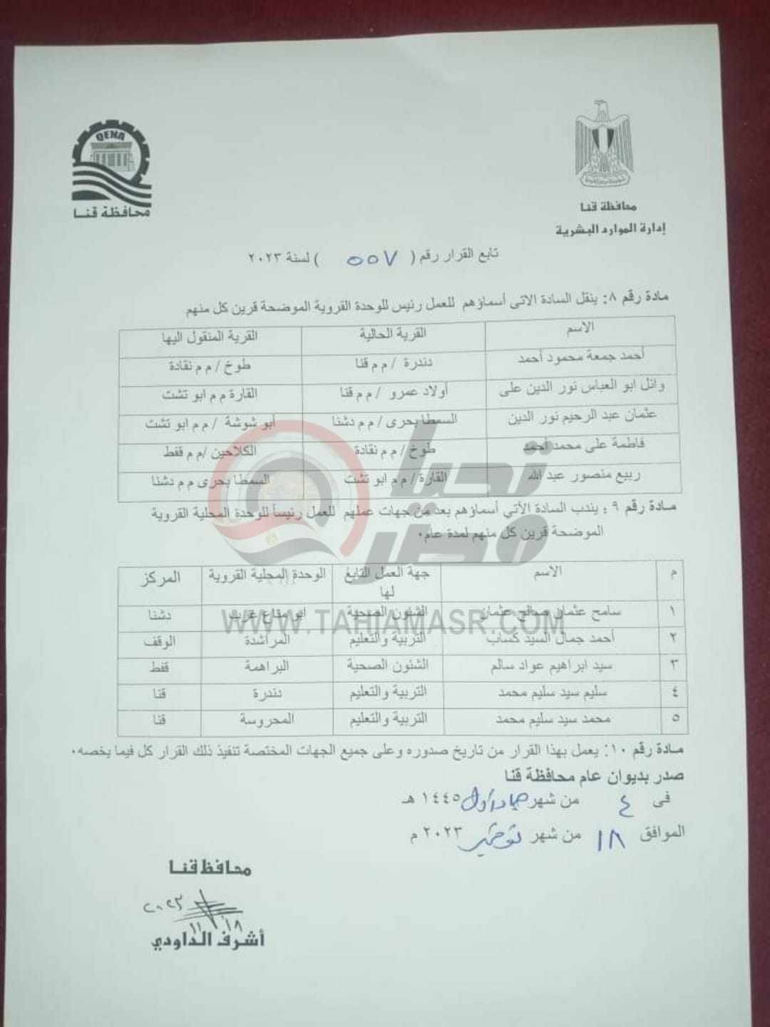 وقد شمل قرار محافظ قنا ندب سامح عثمان علي رئيسا لأبو مناع غرب، وأحمد جمال السيد كساب رئيسا لقرية المراشدة ، وسيد إبراهيم عواد سليم رئيسا لقرية البراهمة ، و سليم سيد سليم رئيسا لقرية دندرة ، ومحمد سيد سليم رئيسا لقرية المحروسة، كما تقرر نقل أحمد جمعة محمود للعمل رئيسا لطوخ بنقادة، وائل أبو العباس نور الدين للعمل رئيسا للقارة في ابوتشت، و عثمان عبد الرحيم نور الدين للعمل رئيسا لقرية أبو شوشة ، فاطمة علي محمد أحمد للعمل رئيسا لقرية الكلاحين بقفط، وربيع منصور عبد الله رئيسا لقرية السمطا بدشنا.