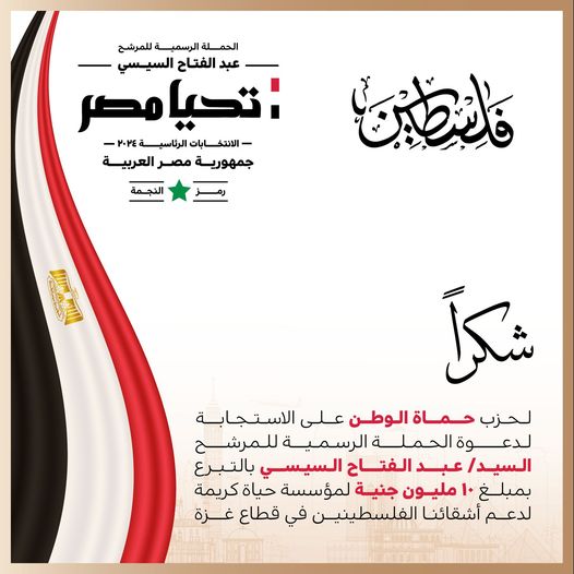 توجهت الحملة الرسمية للمرشح عبد الفتاح السيسي، بالشكر، لحزب حماة الوطن، على تبرعهم تبرعهم بمبلغ ١٠ مليون جنيه لمؤسسة حياة كريمة لدعم أشقائنا في غزة.