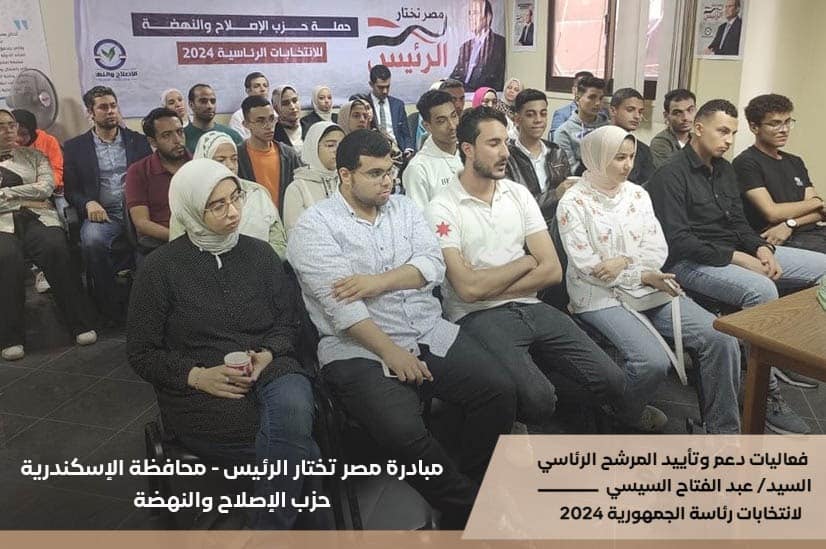 - أطلقت أمانة حزب الإصلاح والنهضة بالاسكندرية مبادرة مصر تختار الرئيس وتنظيم مؤتمر شبابي لزيادة وعي الشباب وتشجيعهم علي المشاركة الايجابية و الفعاله في العملية الانتخابية ودعم المرشح عبد الفتاح السيسي.
