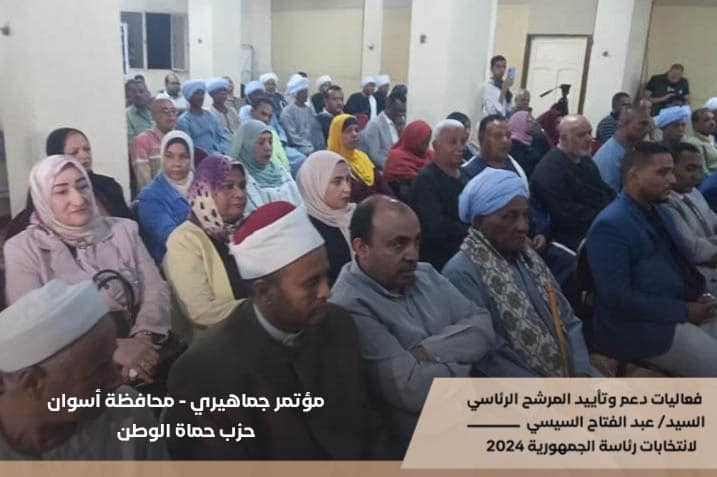 - نظمت أمانة محافظة أسوان بحزب حماة الوطن مؤتمراً جماهيرياً لدعم وتأييد المرشح عبدالفتاح السيسي والتأكيد علي أهمية المشاركة الايجابية والفعالة في الاستحقاق الرئاسي القادم.
