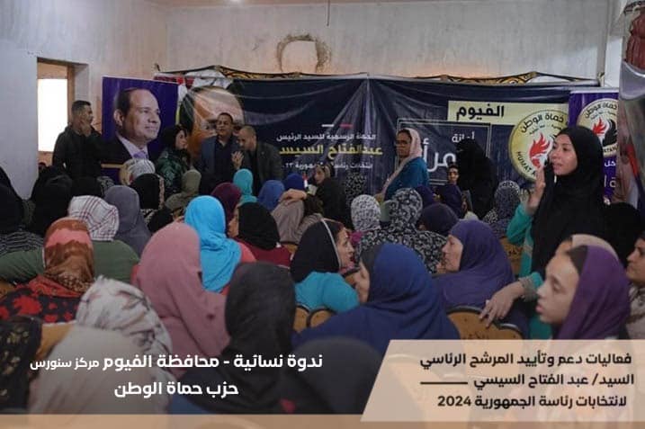 - نظمت أمانة محافظة الفيوم بحزب حماة الوطن ندوة توعوية نسائية بمركز سنورس لإعلان الدعم الكامل للسيد للمرشح عبد الفتاح السيسي والتأكيد علي أهمية دور المرأة المصرية كما قاموا بعرض بعض إنجازات السيد المرشح.