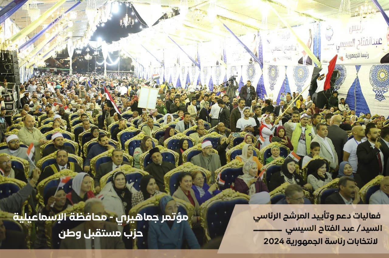 - تظمت أمانة حزب مستقبل وطن بمحافظة الاسماعيلية مؤتمراً حاشداً بإستاد الإسماعيلية لدعم الرئيس عبد الفتاح السيسي كما تم التأكيد على ضرورة مشاركة المرأة في الاستحقاق الرئاسي القادم.