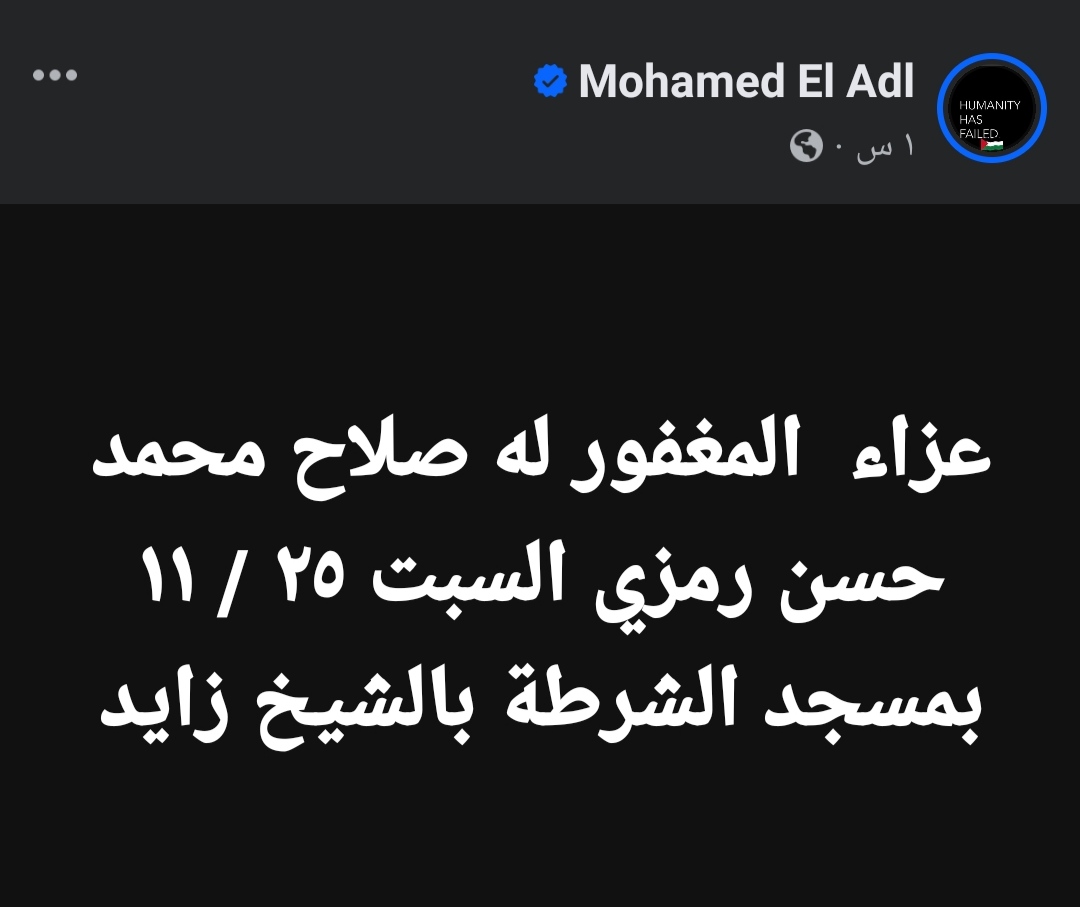 وكتب ماندو العدل: عزاء المغفور له صلاح محمد حسن رمزي السبت ٢٥ / ١١ بمسجد الشرطة بالشيخ زايد.