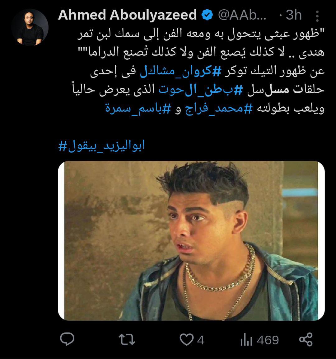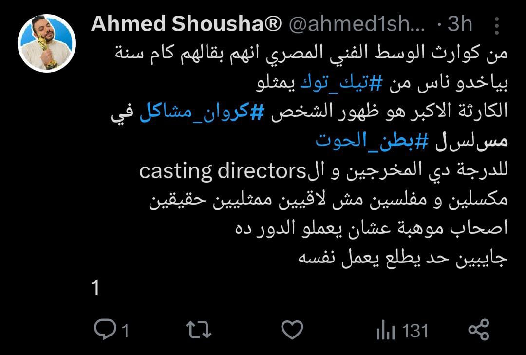 "من كوارث الوسط الفني المصري أنهم بقالهم كام سنة بياخدوا ناس من تيك توك يمثلوا.. والكارثة الأكبر هو ظهور الشخص كروان مشاكل في مسلسل بطن الحوت.. للدرجة دي المخرجين والـ CASTING DIRECTORS مكسلين ومفلسين مش لاقيين ممثليين حقيقيين أصحاب موهبة عشان يعملوا الدور ده.. جايبين حد يطلع يعمل نفسه".