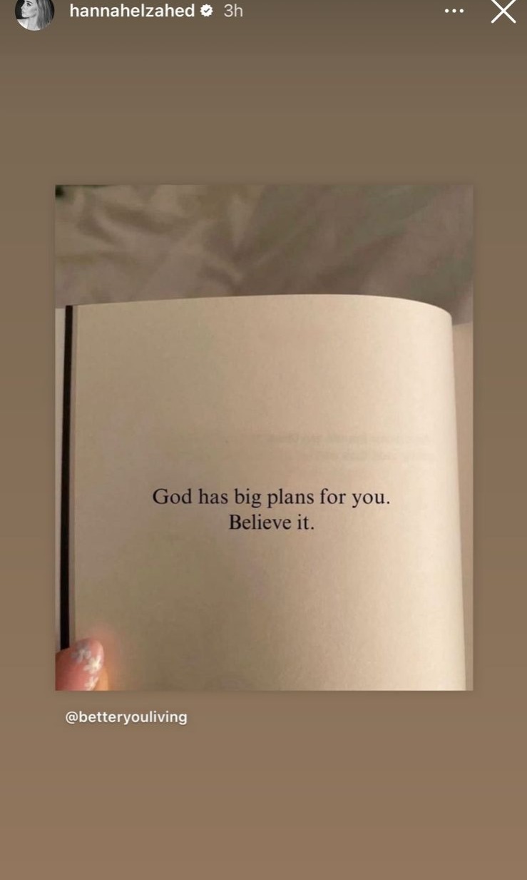 وفي أول تعليق لـ هنا الزاهد بعد انفصالها عن أحمد فهمي، نشرت ستوري عبر حسابها الرسمي بموقع تبادل الصور والفيديوهات انستجرام، قالت فيها: الله لديه الخطط الكبيرة بالنسبة لك صدق ذلك.