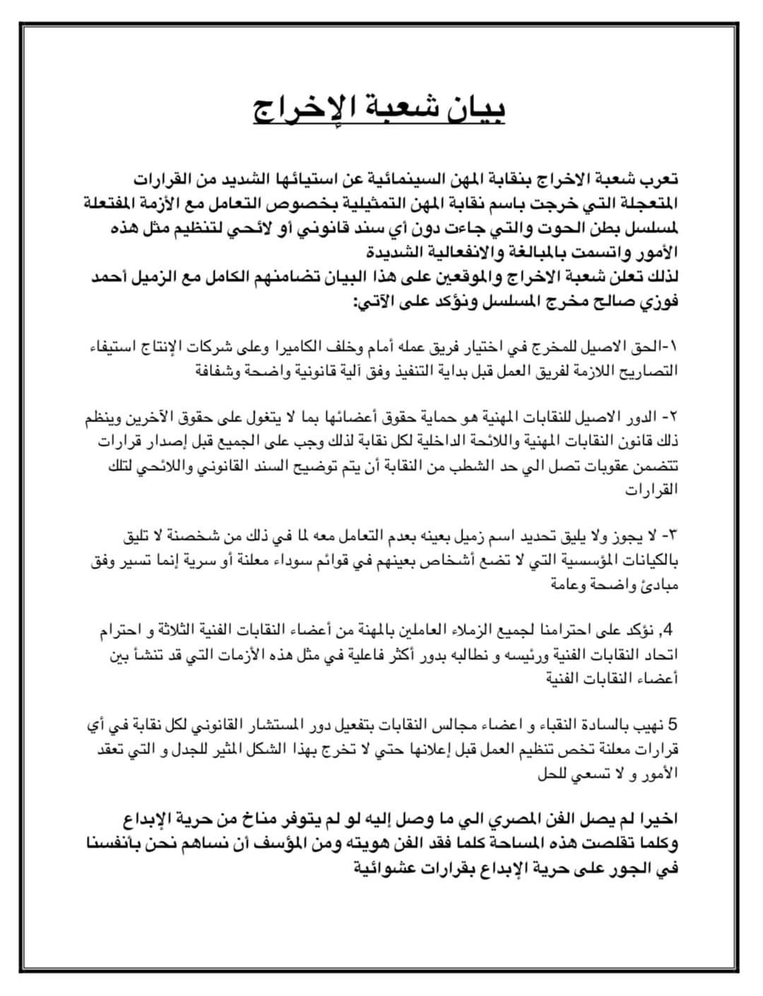 وجاء بيان شعبة الإخراج كالآتي: تعرب شعبة الإخراج بنقابة المهن السينمائية عن استيائها الشديد من القرارات المتعجلة التي خرجت باسم نقابة المهن التمثيلية بخصوص التعامل مع الأزمة المفتعلة لمسلسل بطن الحوت والتي جاءت دون أي سند قانوني أو لائحي لتنظيم مثل هذه الأمور واتسمت بالمبالغة والانفعالية الشديدة، لذلك تعلن شعبة الإخراج والموقعين على هذا البيان تضامنهم الكامل مع الزميل أحمد فوزي صالح مخرج المسلسل.