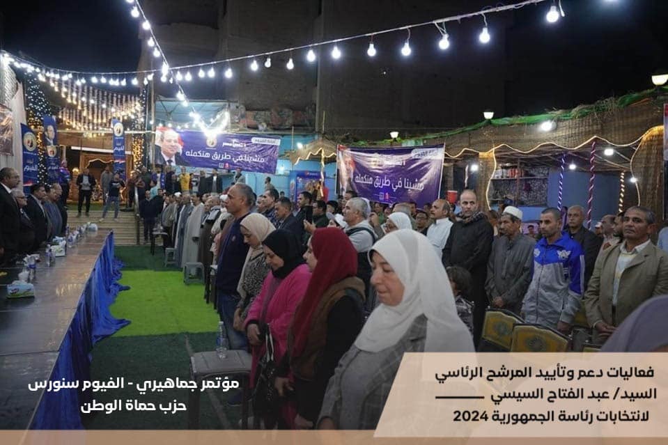 - عقد حزب حماة الوطن بمحافظة الفيوم بتنظيم مؤتمر جماهيري بمركز سنورس لدعم وتأييد المرشح عبد الفتاح السيسي.