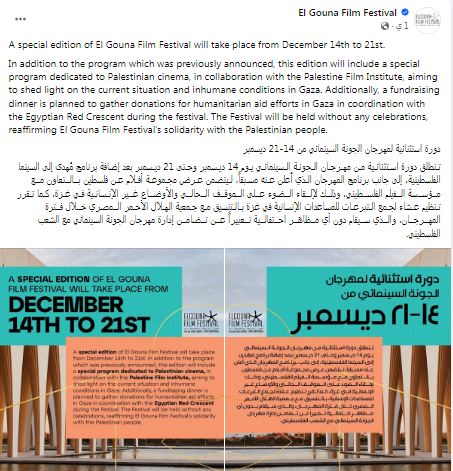 "تنطلق دورة استثنائية من مهرجان الجونة السينمائي يوم 14 ديسمبر وحتى 21 ديسمبر بعد إضافة برنامج مُهدى إلى السينما الفلسطينية، إلى جانب برنامج المهرجان الذي أُعلن عنه مسبقاً، ليتضمن عرض مجموعة أفلام عن فلسطين بالتعاون مع مؤسسة الفيلم الفلسطيني، وذلك لإلقاء الضوء على الموقف الحالي والأوضاع غير الإنسانية في غزة".