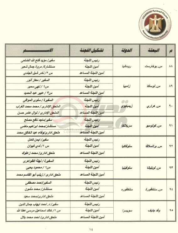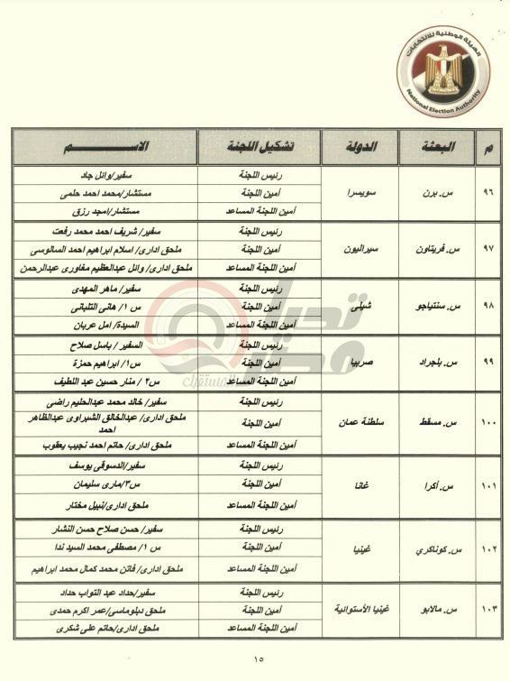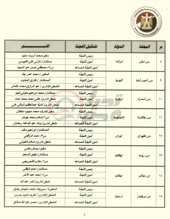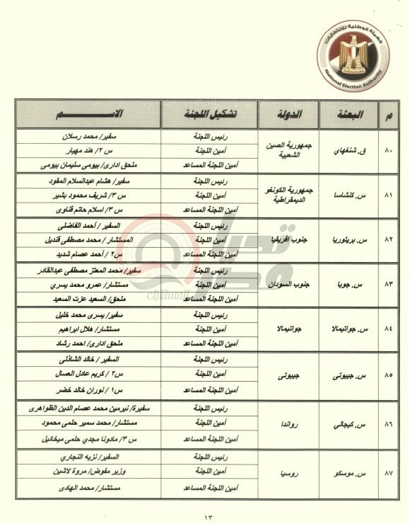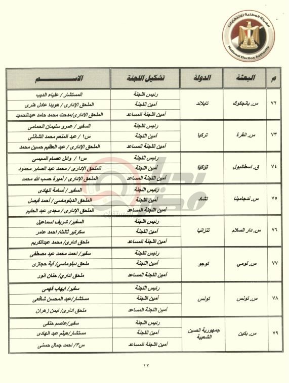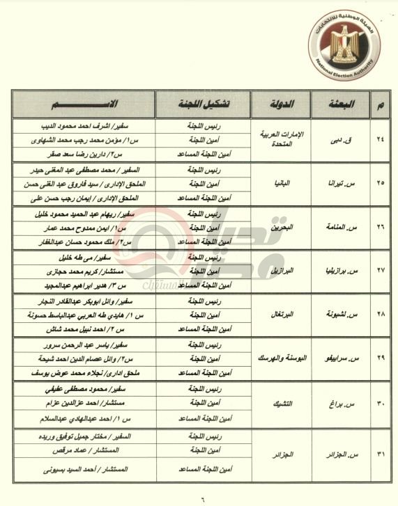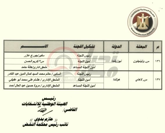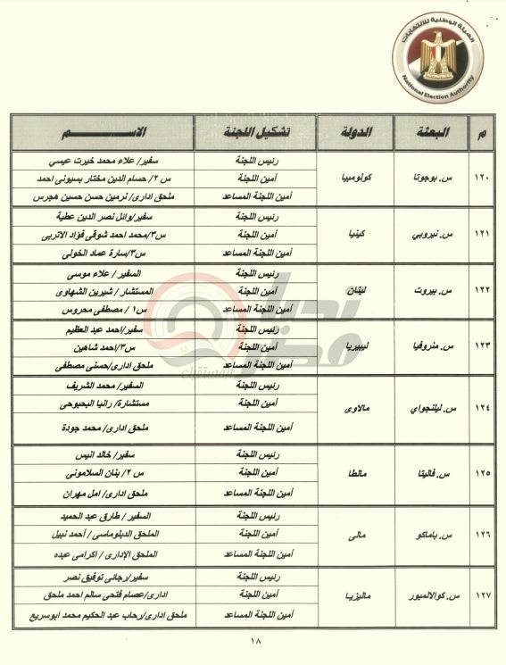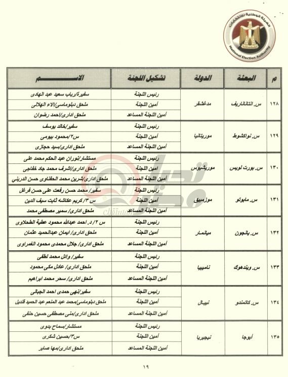 وأعلنت الهيئة الوطنية للانتخابية عن تشكيل اللجان الفرعية المشرفة على الانتخابات الرئاسية 2024 في الخارج، من أعضاء السلك الدبلوماسي والقنصلي والعاملين بوزارة الخارجية، وفقا للجداول المرفقة والمتضمنة أسماء رؤوساء اللجان وأمين اللجنة وأمين اللجنة المساعد في 137 لجنة مختلفة بالدول للتصويت في الانتخابات الرئاسية 2024 في الخارج، حيث تتكون كل لجنة من سفير وأمين اللجنة وأمين اللجنة المساعد، وينشر موقع تحيا مصر تشكيل اللجان الفرعية في 137 دولة في التقرير التالي.