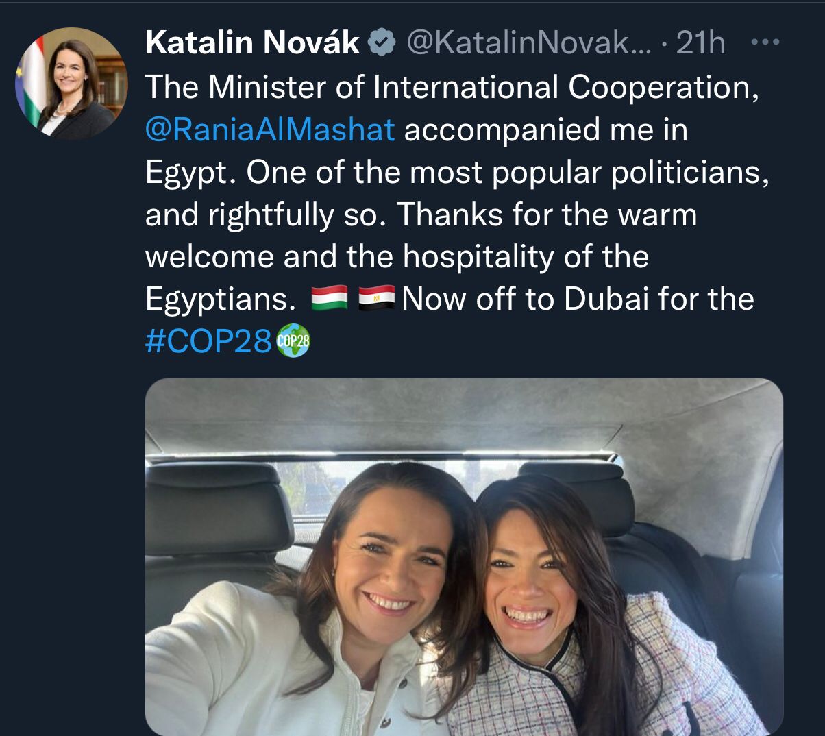 وكتبت رئيسة المجر على صفحتها على انستجرام: "وزيرة التعاون الدولي، كان مرافقي في مصر من أشهر السياسيين.. شكرا على الترحيب الطيب على حسن ضيافة المصريين".