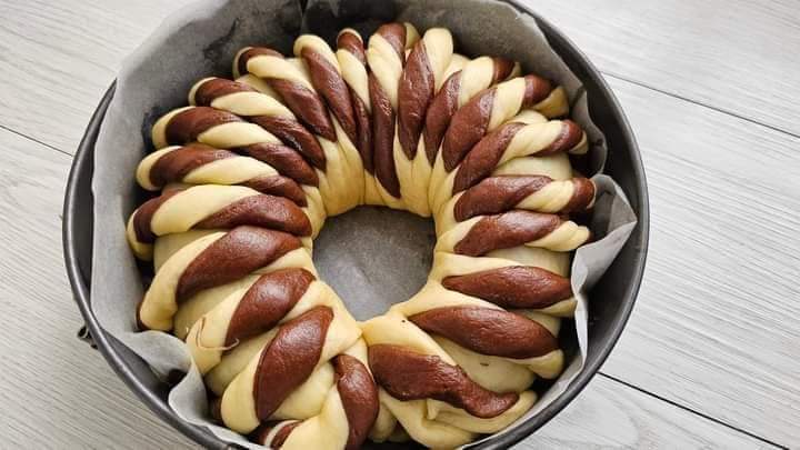 10- ثم يتم وضع عجينة الكاكاو فوق الثانية.