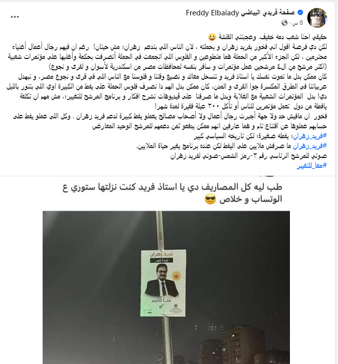 وتابع: الفلوس اللي اتجمعت في الحملة أتصرفت بحكمة وأغلبها على مؤتمرات شعبية أكتر مرشح من الـ 4 مرشحين عمل مؤتمرات وسافر بنفسه لمحافظات مصر من إسكندرية لأسوان ولقرى ونجوع، مردفا: فخور إن الحملة قررت تصرف على المؤتمرات الشعبية أكتر ما تعمل يفط ضخمة، ممكن تكلفة يافطة منهم تعمل مؤتمرين أو تأكل 200 عيلة فقيرة لمدة شهر.