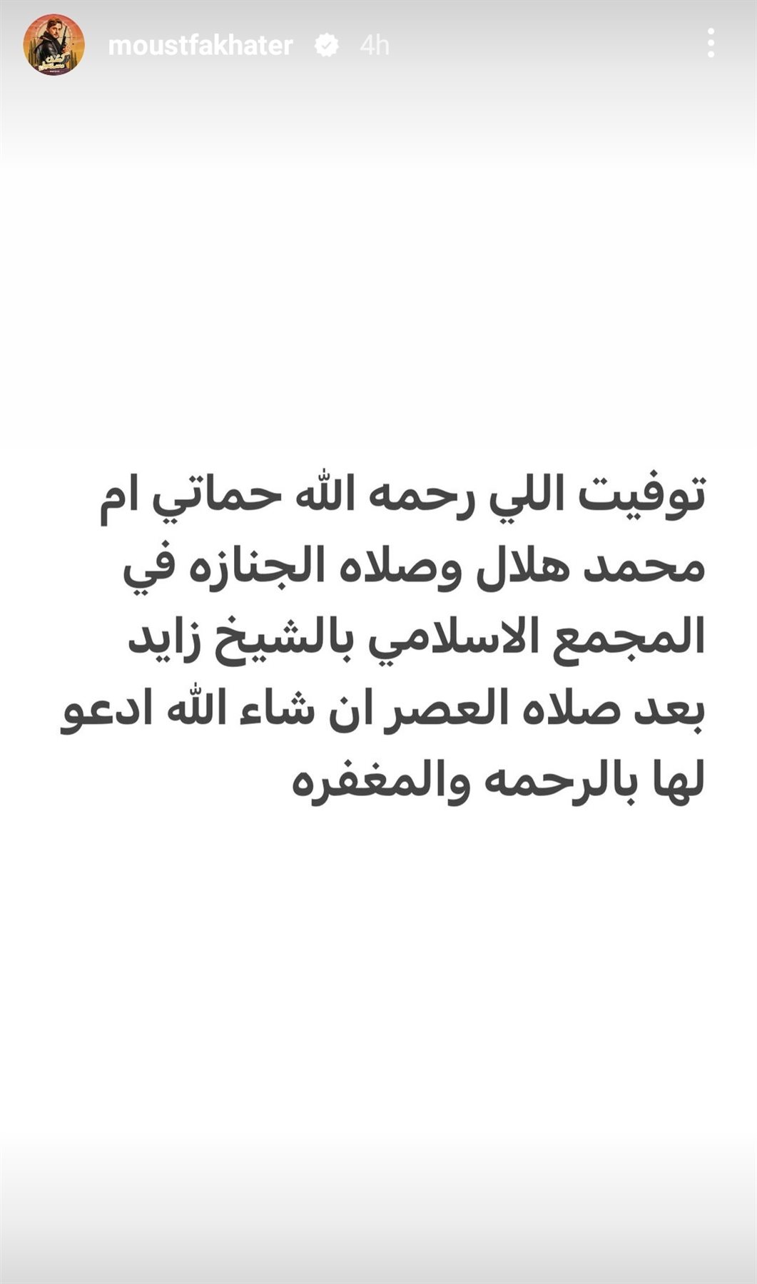 وكتب مصطفى خاطر من خلال خاصية استوري: توفيت إلى رحمة الله حماتي أم محمد هلال وصلاة الجنازة في المجمع الإسلامي بالشيخ زايد بعد صلاة العصر إن شاء الله ادعو لها بالرحمة والمغفرة.