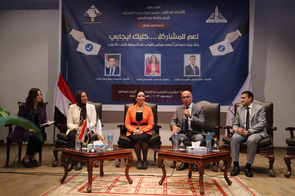 استكملت تنسيقية شباب الأحزاب والسياسيين مؤتمراتها بالجامعات المصرية، في ضوء اهتمامها بتوعية الشباب وتشجيع مشاركتهم الإيجابية في الحياة السياسية، تحت عنوان "نعم للمشاركة.. خليك إيجابي"، بتنظيم مؤتمر في جامعة عين شمس، وسط حضور طلابي كثيف، وذلك بحضور كلاً من الدكتور محمد ضياء رئيس الجامعة، والدكتورة غادة فاروق، نائب رئيس الجامعة لخدمة المجتمع.