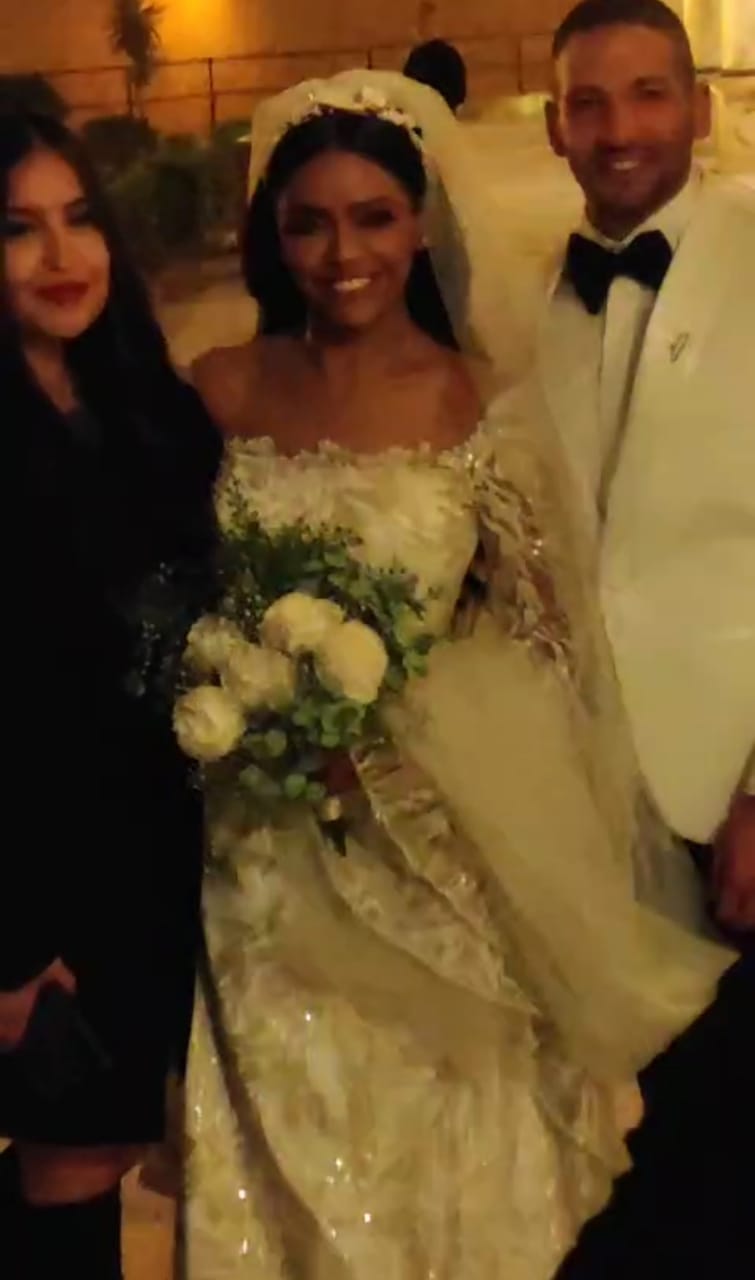 وظهرت أسماء أبو اليزيد مرتدية فستان زفاف باللون الابيض، مع تسريحة شعر بسيطة، ومكياج خفيف، وكان هناك حضورًا نادرًا لنجوم ونجمات الوسط الفني.