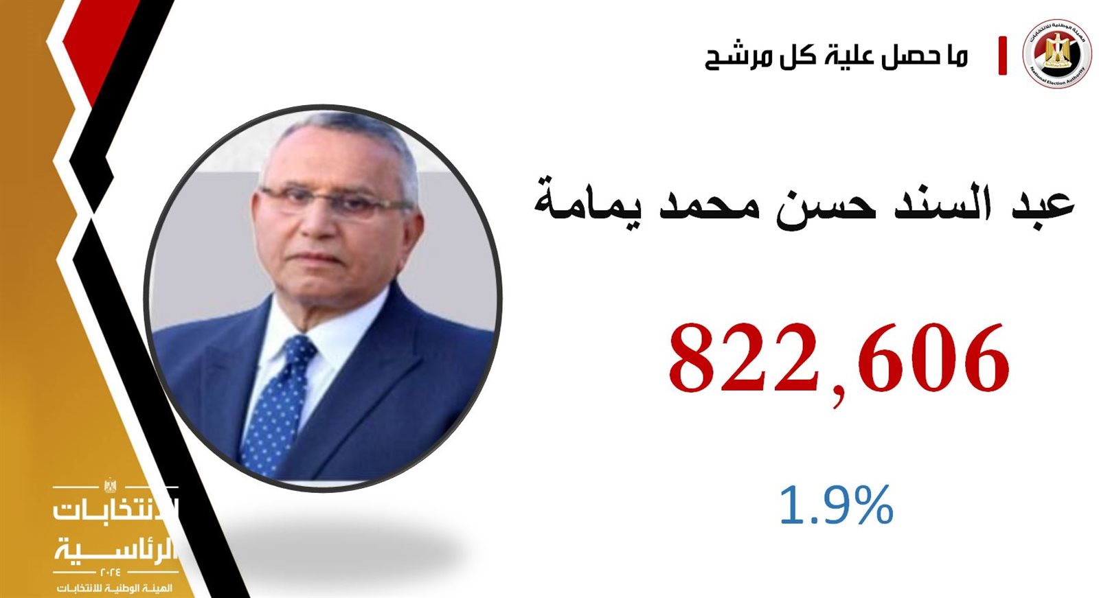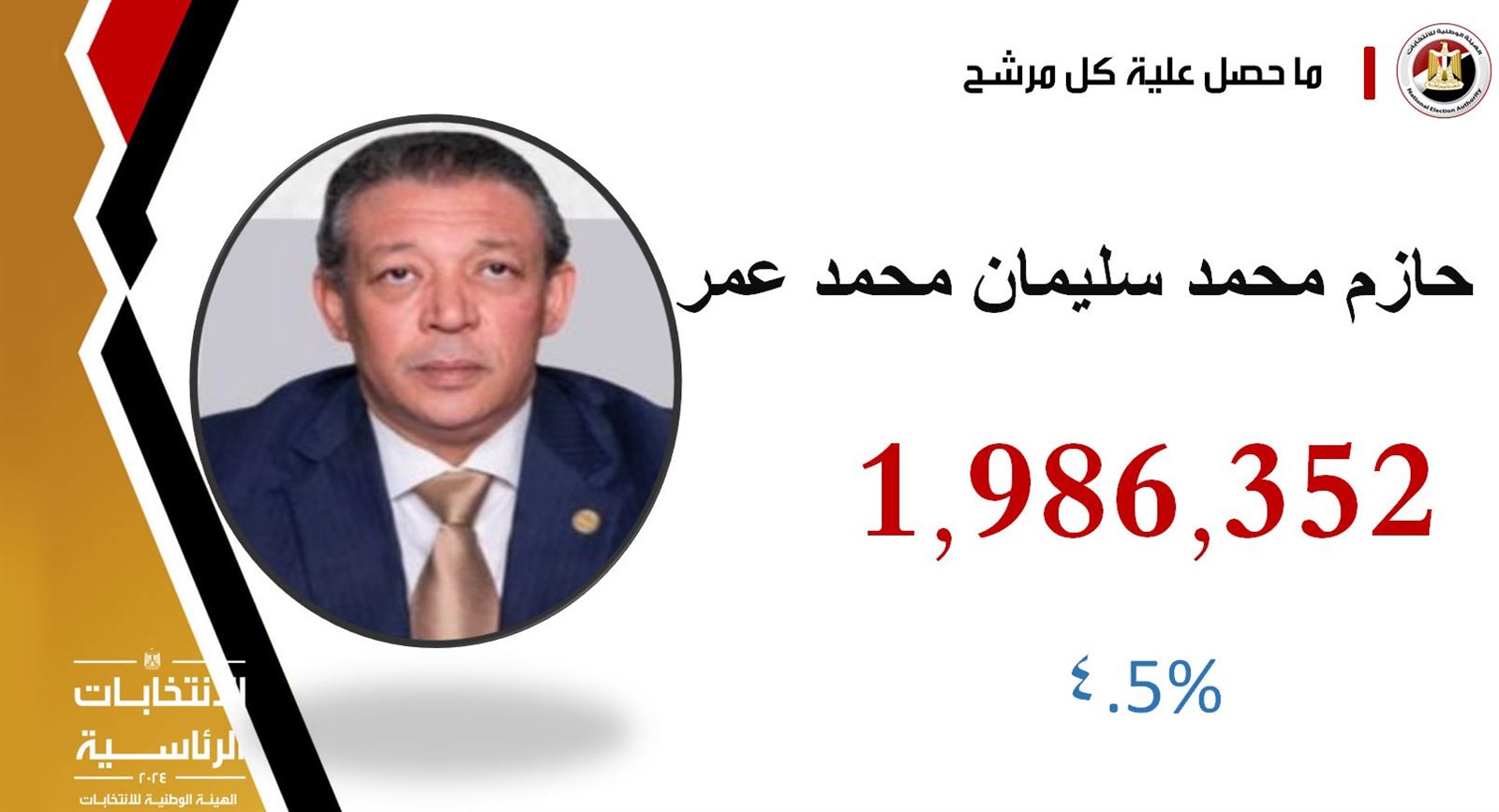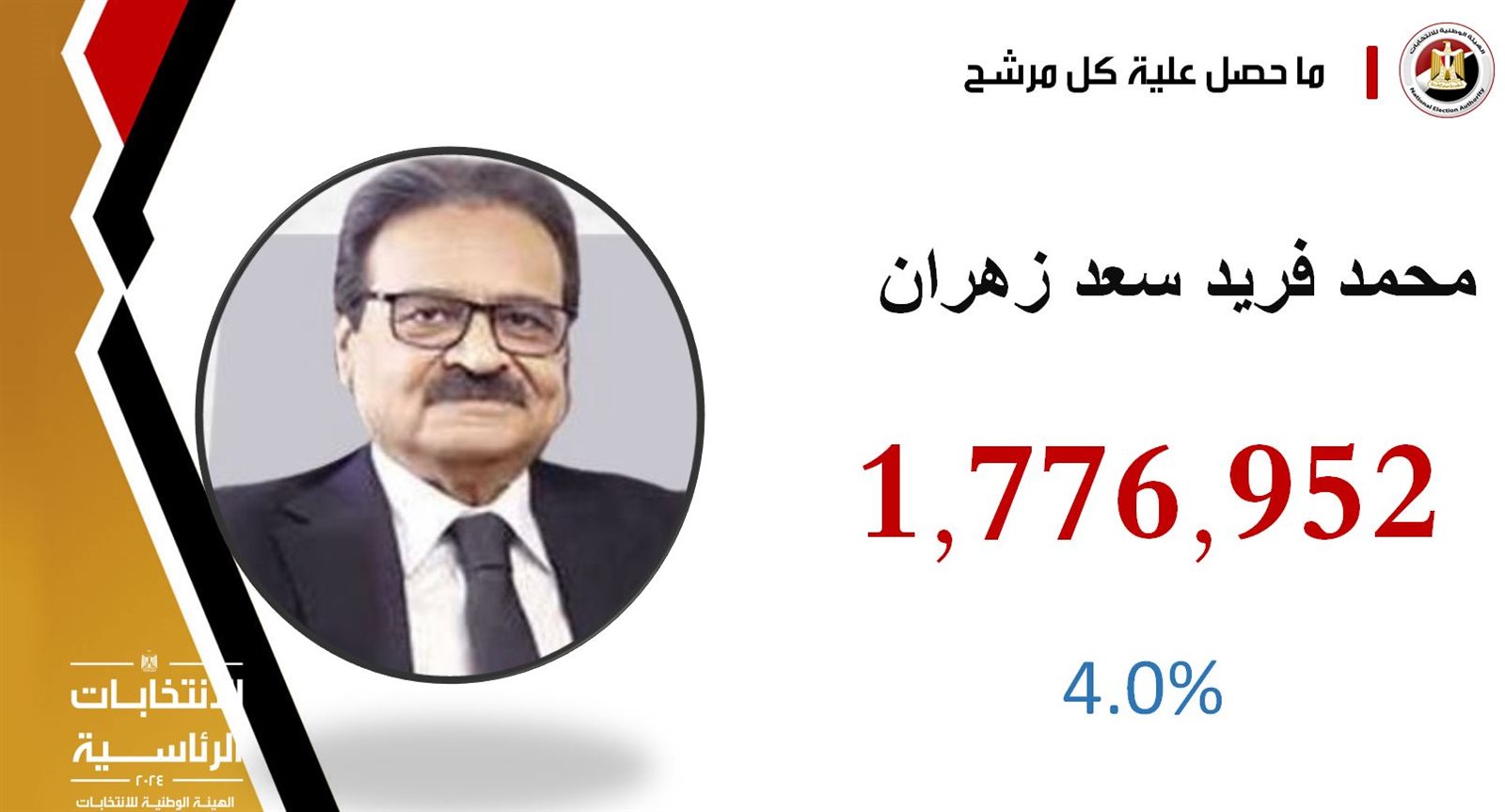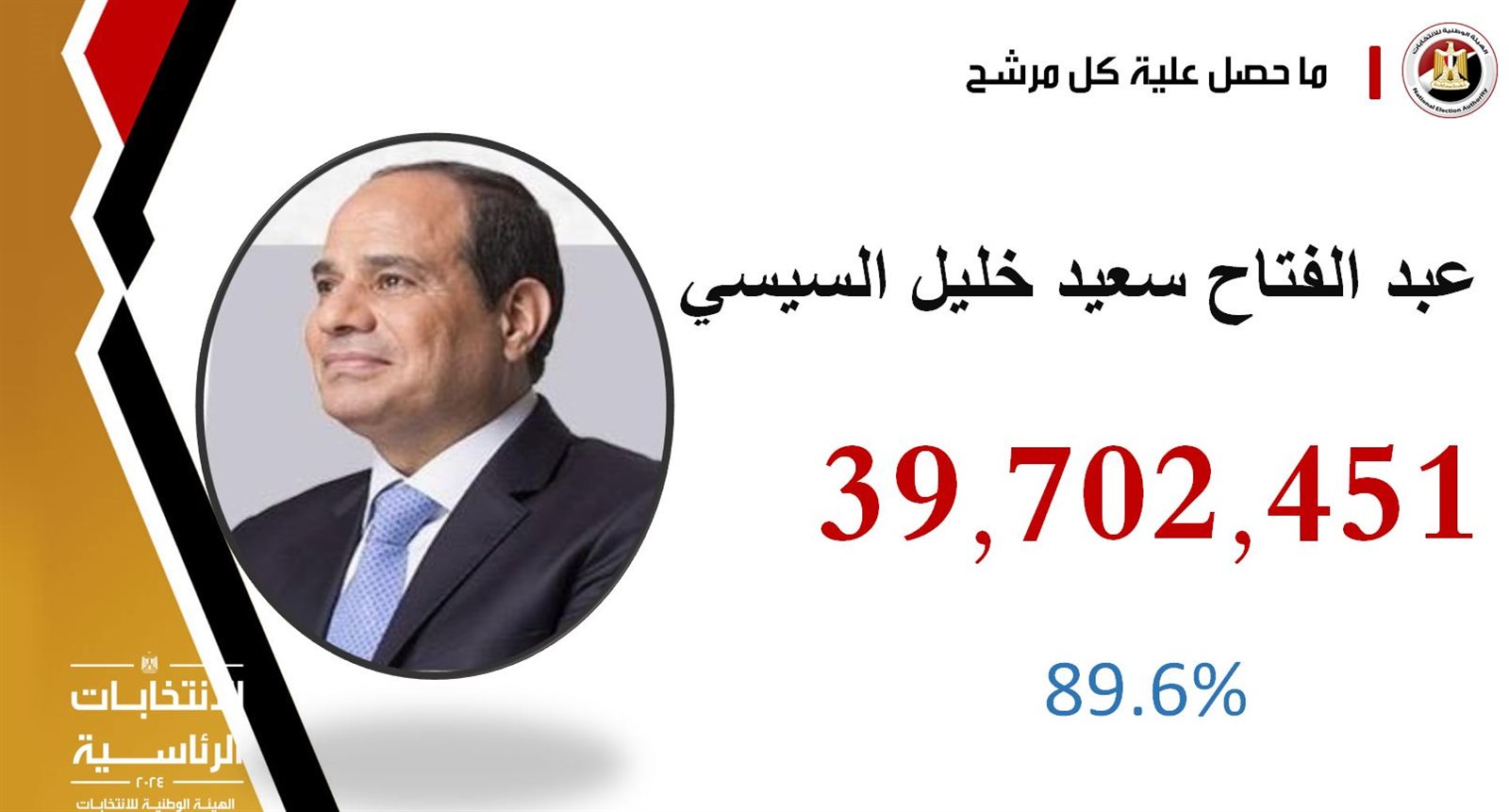 وأعلنت الهيئة الوطنية للانتخابات، نتيجة الانتخابات الرئاسية 2024، حيث فاز الرئيس عبد الفتاح السيسي بعدد أصوات 39 مليون 702 ألف 451 صوتا بنسبة 89.6 من إجمالي الأصوات الصحيحة، والمرشح حازم عمر على عدد أصوات مليون 986 الف 352 صوت بنسبة 4.5% من إجمالي الأصوات الصحيحة، والمرشح فريد زهران على عدد أصوات مليون 776 الف 942 بنسبة 4%، والمرشح عبدالسند يمامة على عدد أصوات 822 ألف 606 صوتا بنسبة 1.9%.