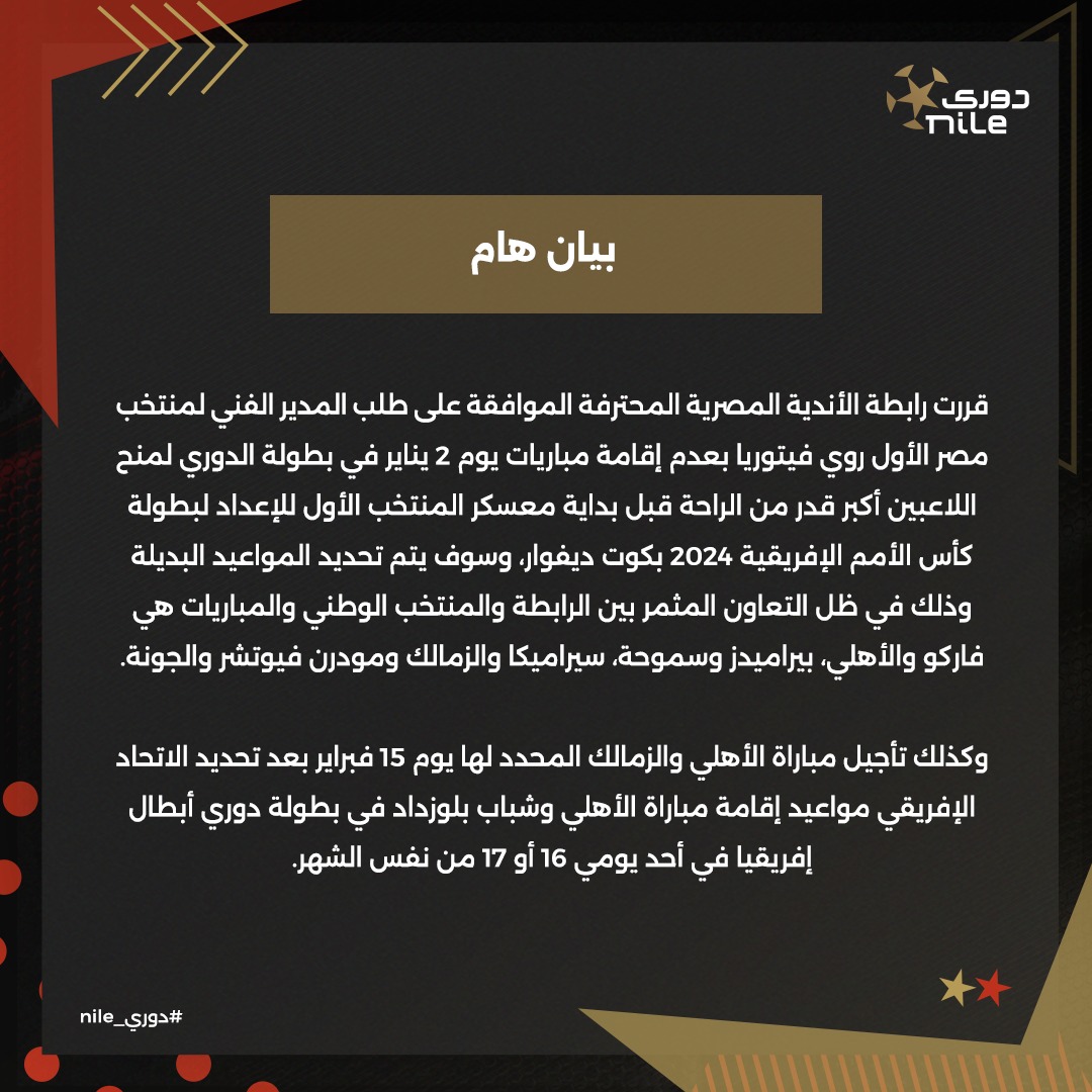 قررت رابطة الأندية المصرية المحترفة الموافقة على طلب المدير الفني لمنتخب مصر الأول روي فيتوريا عدم إقامة مباريات يوم 2 يناير في بطولة الدوري لمنح اللاعبين أكبر قدر من الراحة قبل بداية معسكر المنتخب الأول للإعداد لبطولة كأس الأمم الأفريقية 2024 بكوت ديفوار.