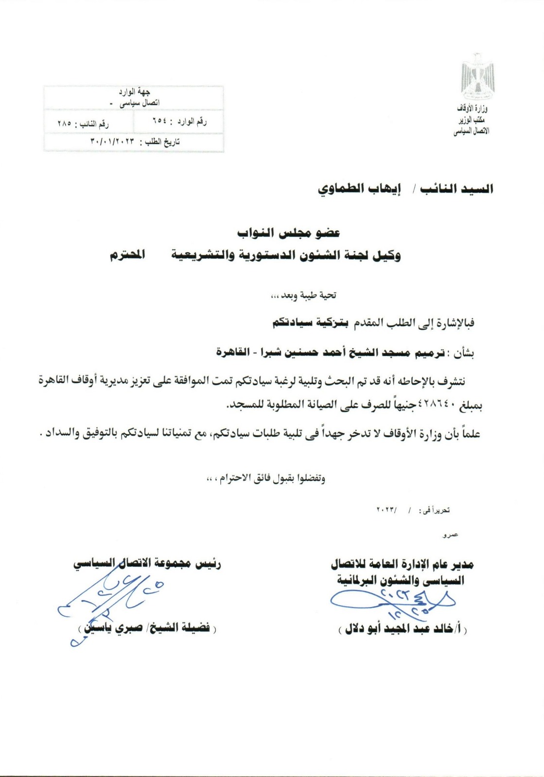 وأوضح بيان الوزارة، بأنه تم البحث وتلبية لرغبة النائب إيهاب الطماوي في ترميم مسجد أحمد حسنين بشارع اللواء فطين روض الفرج خلف التوفيقية، فإنه تم الموافقة على تعزيز مديرية أوقاف القاهرة بمبلغ 428640 جنيهًا، للصرف على الصيانة المطلوبة للمسجد.