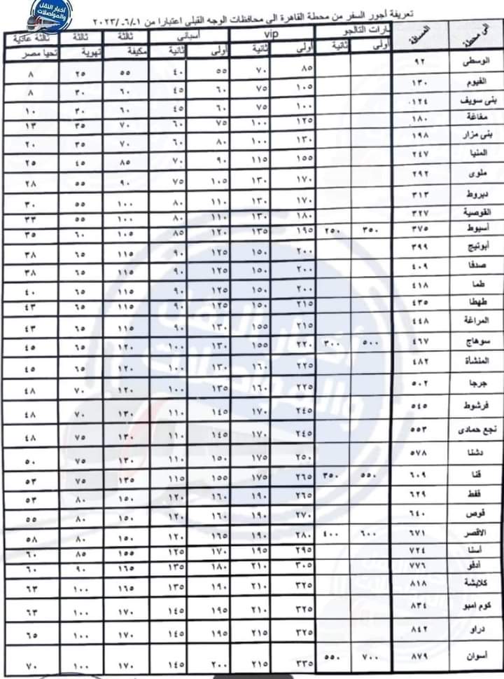 وقد جاءت اسعار تذاكر قطارات أسعار تذاكر قطارات الصعيد والوجه القبلي (تالجو- مكيف- روسي - تحيا مصر- VIP) كما هو موضح: