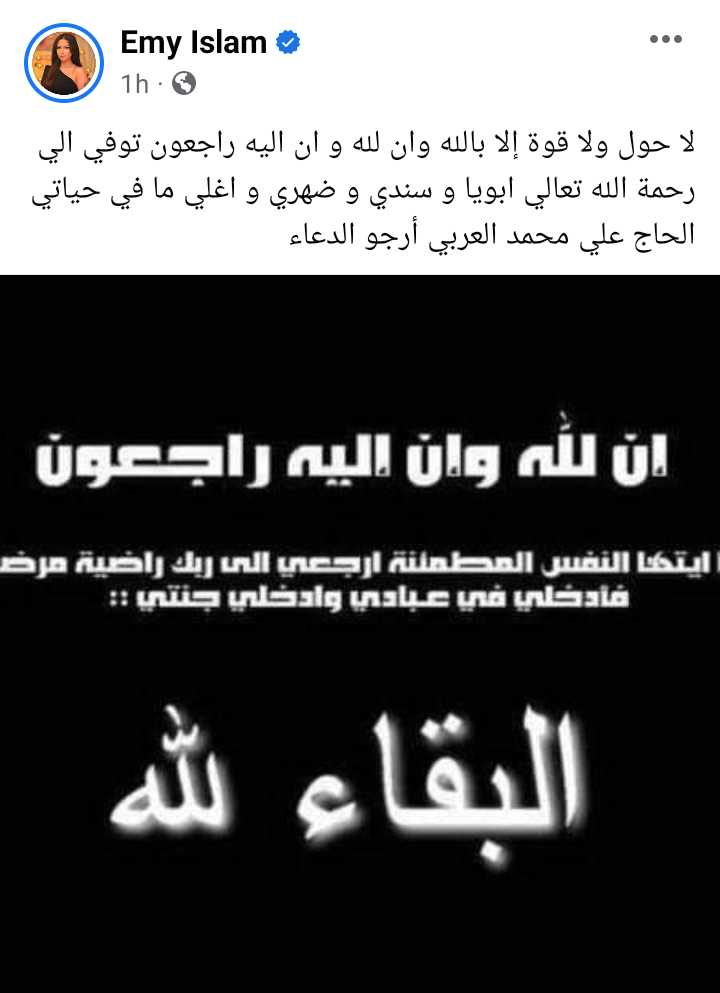 وكتبت الفنانة إيمي اسلام عبر حسابها الرسمي بموقع فيسبوك: لا حول ولا قوة إلا بالله وإنا لله وإنا إليه راجعون.. توفي إلى رحمة الله تعالى أبويا وسندي وضهري وأغلى ما في حياتي الحاج علي محمد العربي.. أرجو الدعاء.