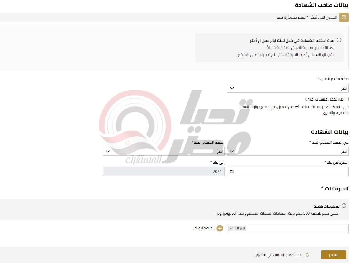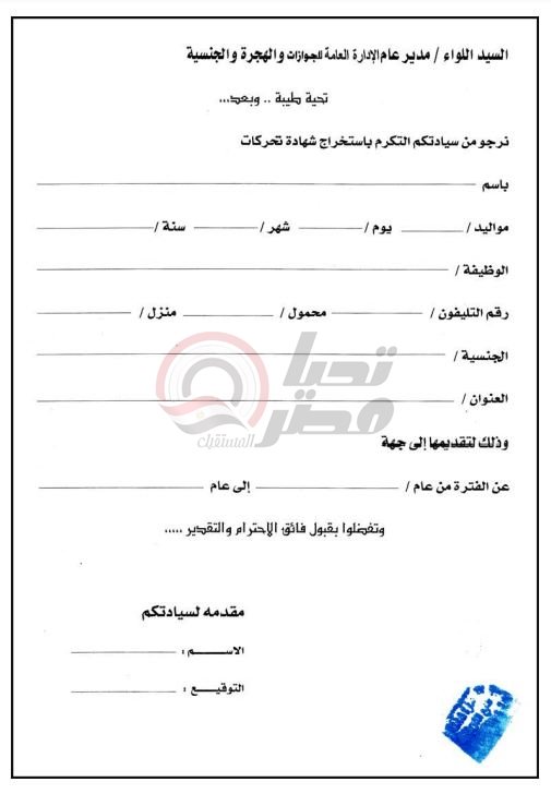 وتتضمن شهادة التحركات 2024، نوع الجهة المقدمة إليها سواء التجنيد أو المرور أو المعاهد والكليات وايضا السفارات والوزارات وغيرها من الهيئات، والفترة الزمنية المطلوبة، والاسم والرقم القومي ومحافظة الميلاد وتاريخ الميلاد وايضا العنوان والوظيفة والبيانات الخاصة بصاحبها.