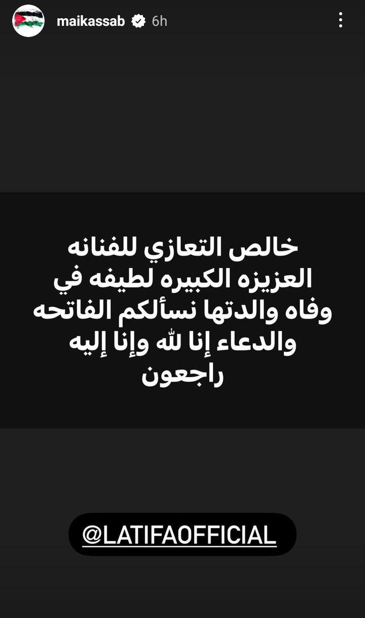 ورصد موقع تحيا مصر رسالة مي كساب للمطربة لطيفة والتي نشرتها خلال خاصية ستوري بموقع انستجرام: خالص التعازي للفنانة الكبيرة العزيزة لطيفة في وفاة والدتها.. نسألكم الفاتحة والدعاء.. انا الله وانا اليه راجعون.