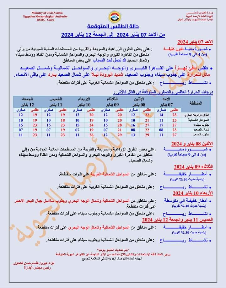 حيث تسود خلال الأيام القادمة تسود شبورة مائية كثيفة صباحاً على الطرق الزراعية والسريعة والقريبة من المسطحات المائية المؤدية من وإلى مناطق من القاهرة الكبرى والوجه البحري والسواحل الشمالية ومدن القناة ووسط سيناء وشمال الصعيد والتي قد تصل لحد الضباب على بعض المناطق.