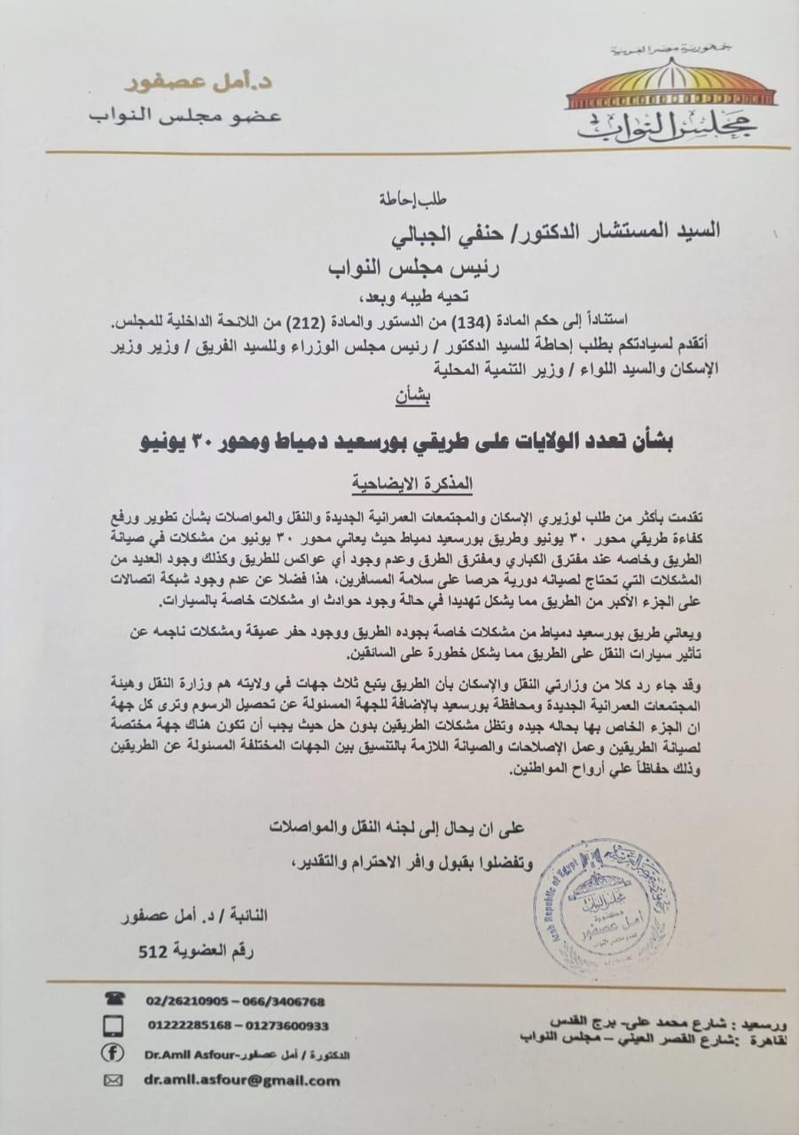 طلب إحاطة للنائبة أمل عصفور حول تعدد الولايات على طرقي بورسعيد دمياط ومحور 30يونيو