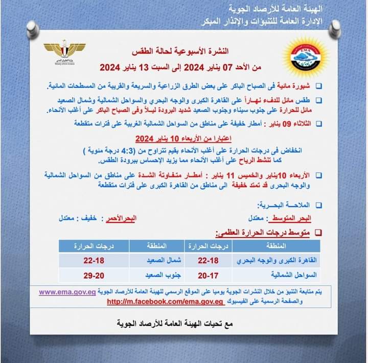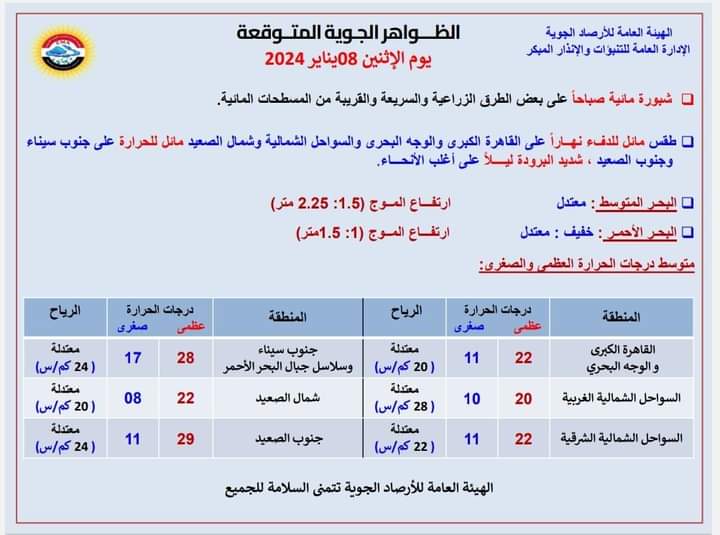 واعلنت هيئة الأرصاد الجوية عن حالة الطقس اليوم الاثنين 8 يناير 2024 والذى يشهد حالة من الاستقرار فى الأحوال الجوية على كافة الأنحاء، والتى تستمر حتى يوم الثلاثاء، مشيرة إلى أنه اعتبارا من يوم الأربعاء ١٠ يناير ٢٠٢٤ سيكون هناك انخفاض في درجات الحرارة على ️أغلب الأنحاء بقيم تتراوح من (٤:٣) درجة مئوية.