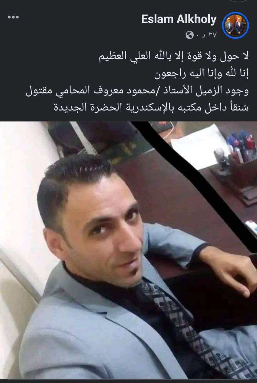 ونشر المتحدث الإعلامي لـ لجنة الفكر القانوني بنقابة المحامين، على صفحته الشخصية عبر موقع التواصل الاجتماعي فيس بوك منشورا عن وفاة المحام محمود معروف داخل مكتبه في محافظة الإسكندرية بمنطقة الحضرة الجديدة.