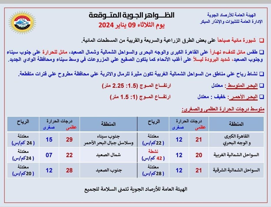 حالة الطقس اليوم الثلاثاء 9 يناير 2024 في مصر