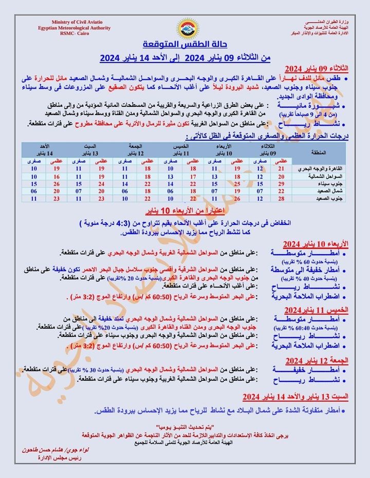أعلنت الهيئة العامة للأرصاد عن تفاصيل حالة الطقس المتوقعة، غدا الثلاثاء وحتى الأحد 14 يناير 2024، حيث يستعرض موقع تحيا مصر التفاصيل.