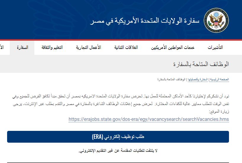 ويمكن الدخول على موقع التقديم في وظائف السفارة الأمريكية بالقاهرة، من خلال الرابط التالي، حيث يقوم المهتمون بالاتحاق بوظائف الوزارة بالدخول على الموقع والضغط عليه من هنا.