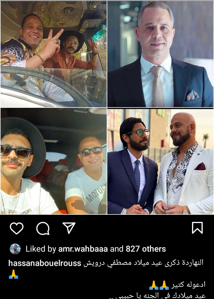 ونشر حسن أبو الروس في منشور رصده موقع تحيا مصر مجموعة صور تجمعه بالفنان مصطفى درويش عبر موقع انستجرام وعلق عليها، قائلا: النهاردة ذكرى عيد ميلاد مصطفي درويش ادعوله كتير عيد ميلادك في الجنه يا حبيبي.