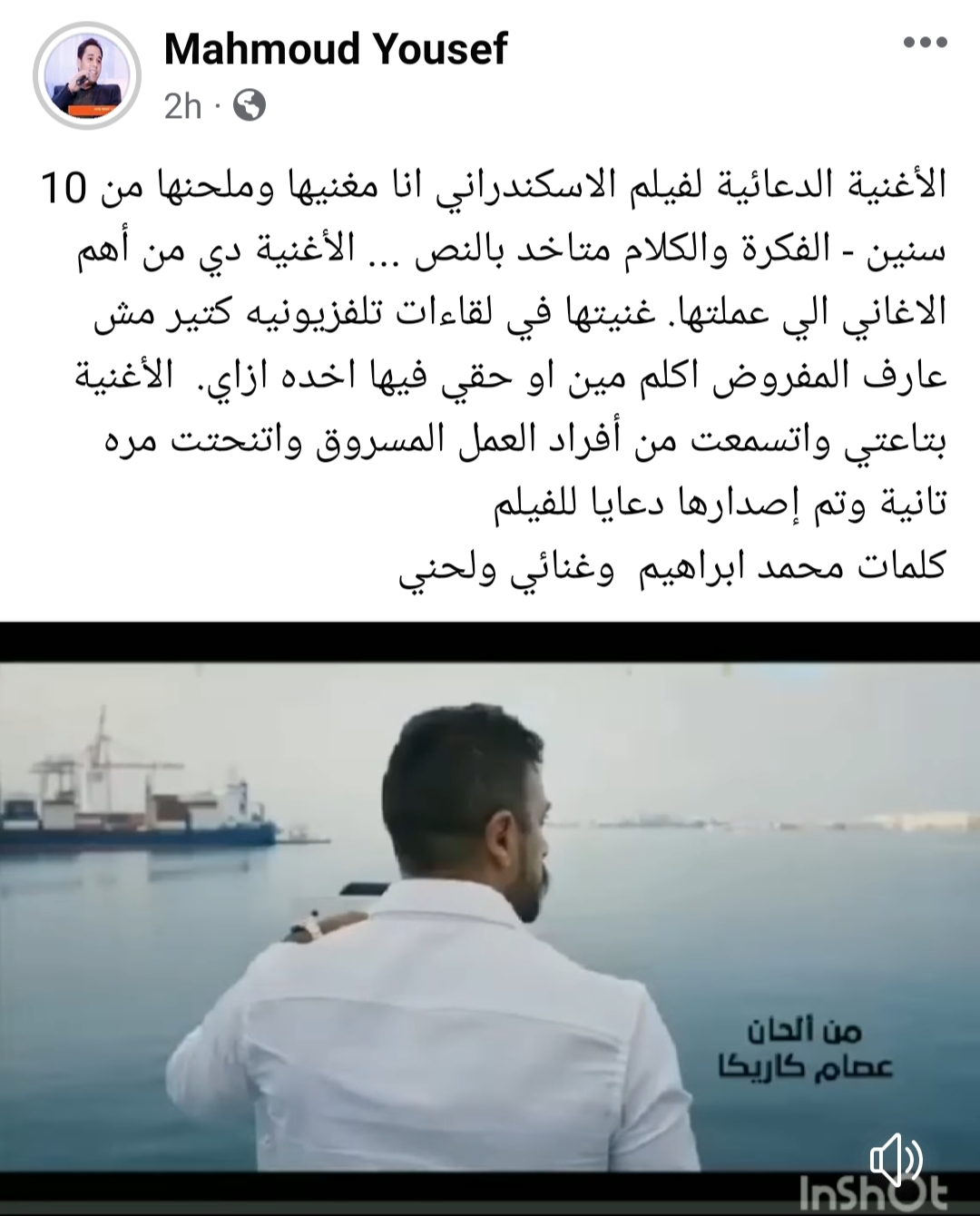 ونشر محمود يوسف مقطع من الأغنية الدعائية لفيلم الإسكندراني وأغنيته المنشورة عبر موقع الفيديوهات الشهير يوتيوب، وذلك عبر حسابه الشخصي بموقع التواصل الاجتماعي فيسبوك، وفي تعليق رصده تحيا مصر قال: الأغنية الدعائية لفيلم الاسكندراني انا مغنيها وملحنها من 10 سنين - الفكرة والكلام متاخد بالنص ... الأغنية دي من أهم الاغاني الي عملتها. غنيتها في لقاءات تلفزيونيه كتير مش عارف المفروض اكلم مين او حقي فيها اخده ازاي.
