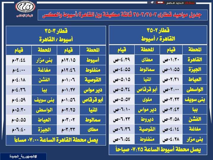 حيث تقرر اعتباراً من يوم السبت الماضي 13 / 1 / 2024 تشغيل قطار 3502 القاهرة / أسيوط بتركيب 8 عربات ثالثة مكيفة يقوم من محطة القاهرة الساعة 01:30 صباحاً ويصل محطة أسيوط الساعة 07:25 صباحاً ، وتشغيل قطار 3503 أسيوط / القاهرة يقوم من محطة أسيوط الساعة 12:15 ظهراً ويصل محطة القاهرة الساعة 07:00 مساءاً بنفس التركيب الوارد به قطار 3502 لمحطة أسيوط طبقاً للجداول المرفقة.