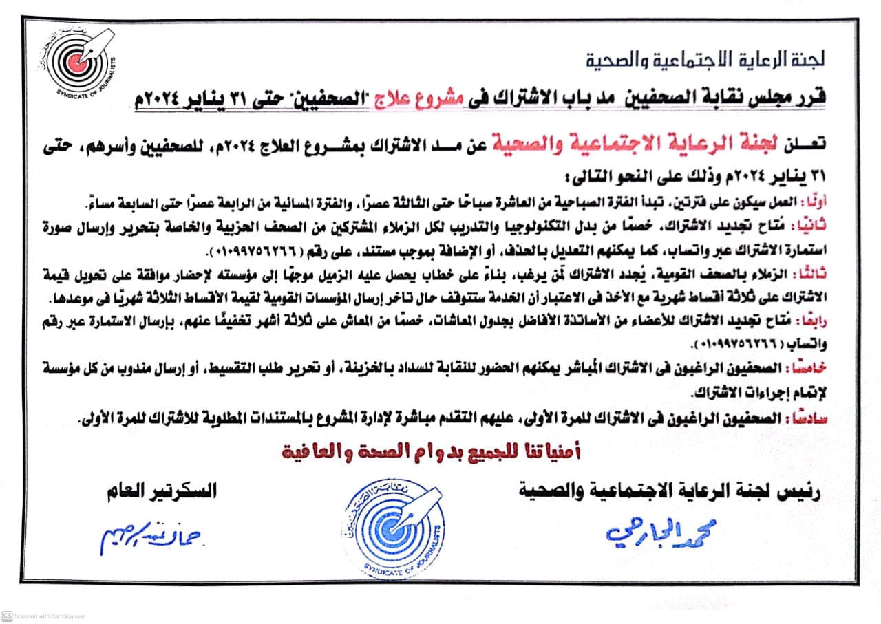 وذكرت لجنة الرعاية الاجتماعية والصحية عن مد الاشتراك بمشروع العلاج بنقابة الصحفيين أنه مُتاح تجديد الاشتراك للأعضاء من الأساتذة الأفاضل بجدول المعاشات، خصمًا من المعاش على ثلاثة أشهر تخفيفًا عنهم، بإرسال الاستمارة عبر رقم واتسآب (01099756266).
