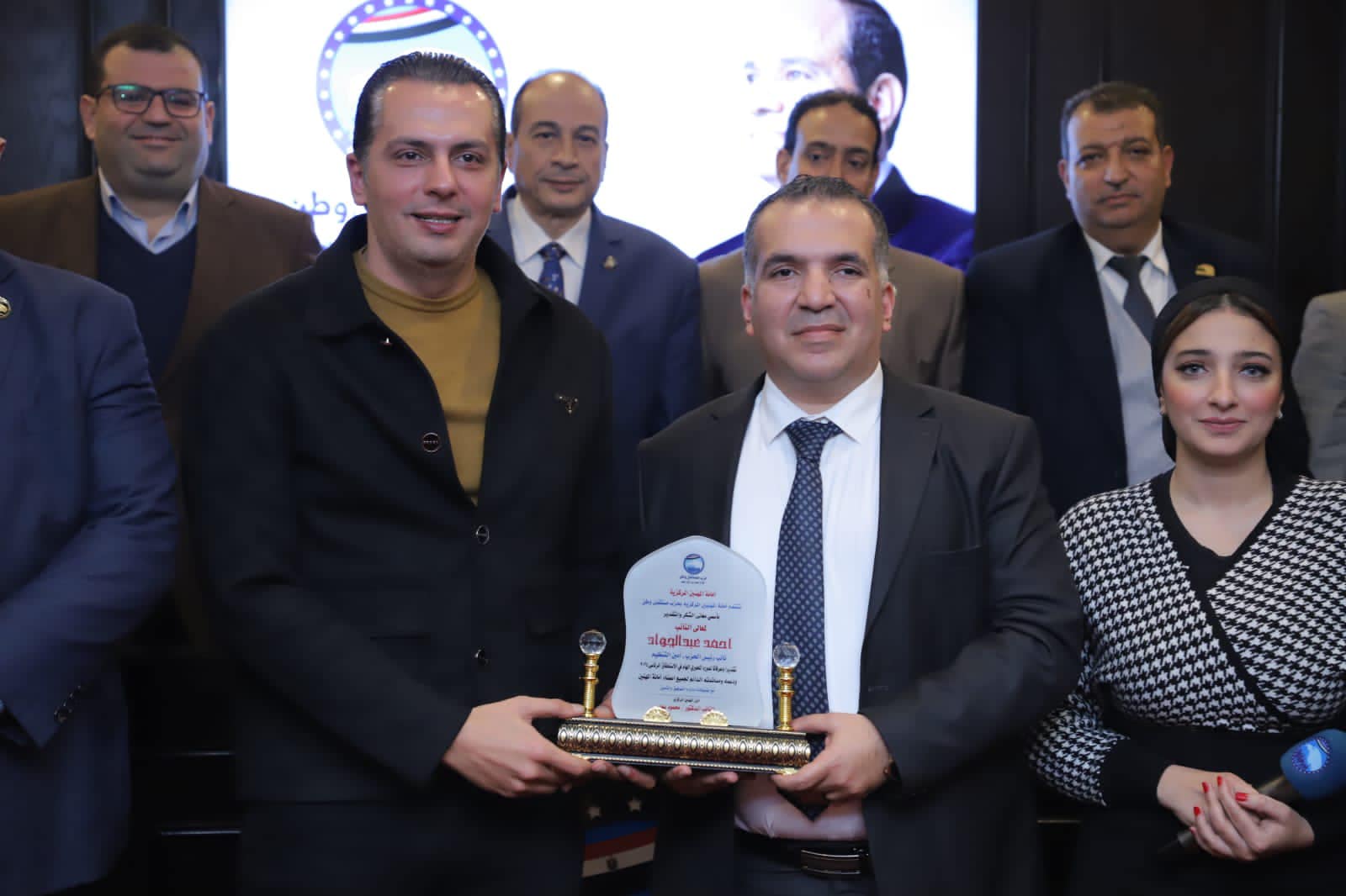 وخلال الاحتفالية، تم منح الأمناء المساعدين وأعضاء هيئة مكتب أمانة المهنيين المركزية، وأمناء المهنيين في المحافظات، دروع التكريم تقديراً لجهودهم خلال الاستحقاق الانتخابي.